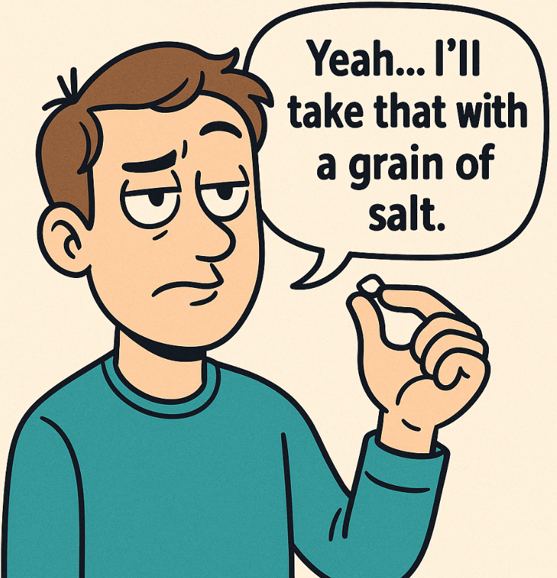 Take it with a grain of salt (a pinch of salt) 는 그대로 해석하면 소금 한 알 정도를 곁들여서 받아 들여라는 말인데, 뭔가를 그대로, 곧이곧대로 믿지 말라는 뜻이다.