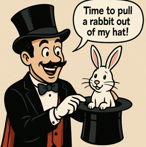 직역하면 모자에서 토끼를 꺼내다 인데, 그 유래는 다름 아닌 마술의 고전적인 장면에서 비롯됐다. Pulling a rabbit out of a hat는 19세기 초 마술사들이 쓰던 고전적인 트릭에서 유래됐다. 마술사들이 모자 속에 아무것도 없는 것처럼 보여주다가 갑자기 토끼를 꺼내는 장면은 당시 관객들에게 굉장한 충격을 줬고, 이 장면이 곧 예상치 못한 놀라운 결과의 상징이 되었다.