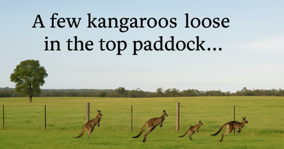 여기서 paddock은 가축을 풀어놓는 울타리로 둘러싸인 목초지를 뜻하고, top paddock은 호주에서 비유적으로 사람의 머리(정신)를 뜻한다. 머릿속이라는 들판에 캥거루가 정신없이 뛰어다니는 모습을 떠올리게 하며, 이는 누군가가 엉뚱하거나 제정신이 아닌 듯한 상태를 뜻하는 호주 특유의 유머러스한 표현으로 자리 잡았다.