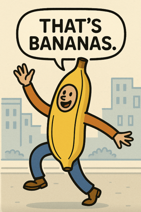 당시 유행하던 go ape라는 표현에서 영향을 받은 것으로 보인다. 바나나는 원래 감정 표현과 관련 없는 과일이지만, 원숭이가 바나나를 보면 흥분한다는 이미지가 청소년 문화 속에서 유머스럽게 받아들여졌다. 이러한 상징에서 bananas가 미쳤다 또는 제정신이 아닌 상태를 뜻하는 은어로 사용되기 시작했다. 이후 미국을 넘어 영국, 호주 등 영어권 전반으로 퍼지며 일상 속에서 흔히 쓰이는 유쾌한 표현으로 자리 잡았다.