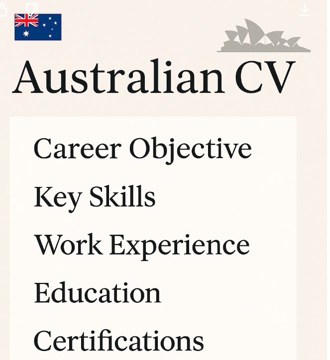 호주의 이력서 양식은 북미쪽이나 다른 영어권과 조금 다른데, 딱히 정해져 있는 규격은 없지만 호주의 일반적인 이력서 양식을 따르는 것이 좋다.