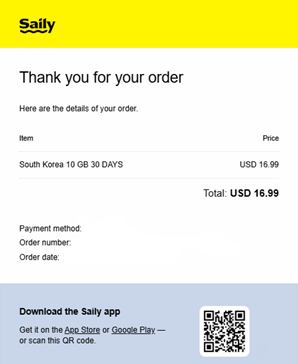 구매를 하면 아래처럼 이메일이 오는데 하단의 QR Code를 스캔해서 Saily 앱을 설치하면 자동으로 eSIM이 설치된다.