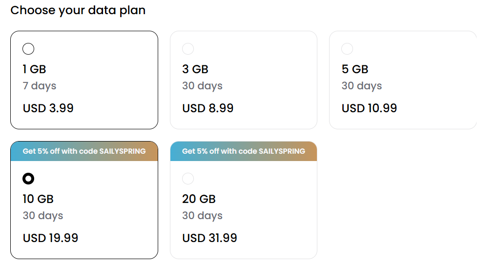 Saily.com에 들어가서 여행국가를 선택하고 10기가 한달짜리 플랜을 구매했다.